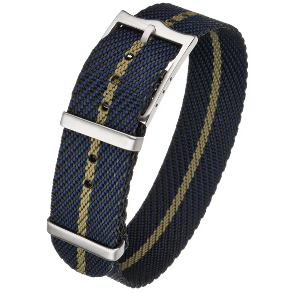 Our Tactical Premium Nylon Military Strap is a single pass strap compatible with Tudor watches. In Blue/Black with a Green Stripe it uses a premium slanted nylon that is strong and durable. Designed to suit Tudor watches, it looks particularly great paired with the Black Bay. However, it would also fit any watch with a standard 20mm or 22mm lug width.