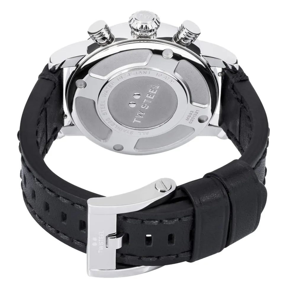 Finally, the vintage style strap is in black leather with stitched sides. The over stitching where the strap meets the case is a retro detail and is next to the trademark dots from the TW Steel logo. A durable stainless steel buckle secures it to the wrist.