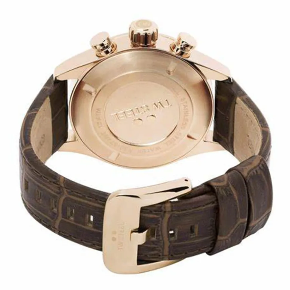 Finally, the brown strap is smart with stitched sides and an alligator grain. Also it has the trademark dots from the TW Steel logo where it meets the case. A strong, rose gold PVD buckle secures it to the wrist.
