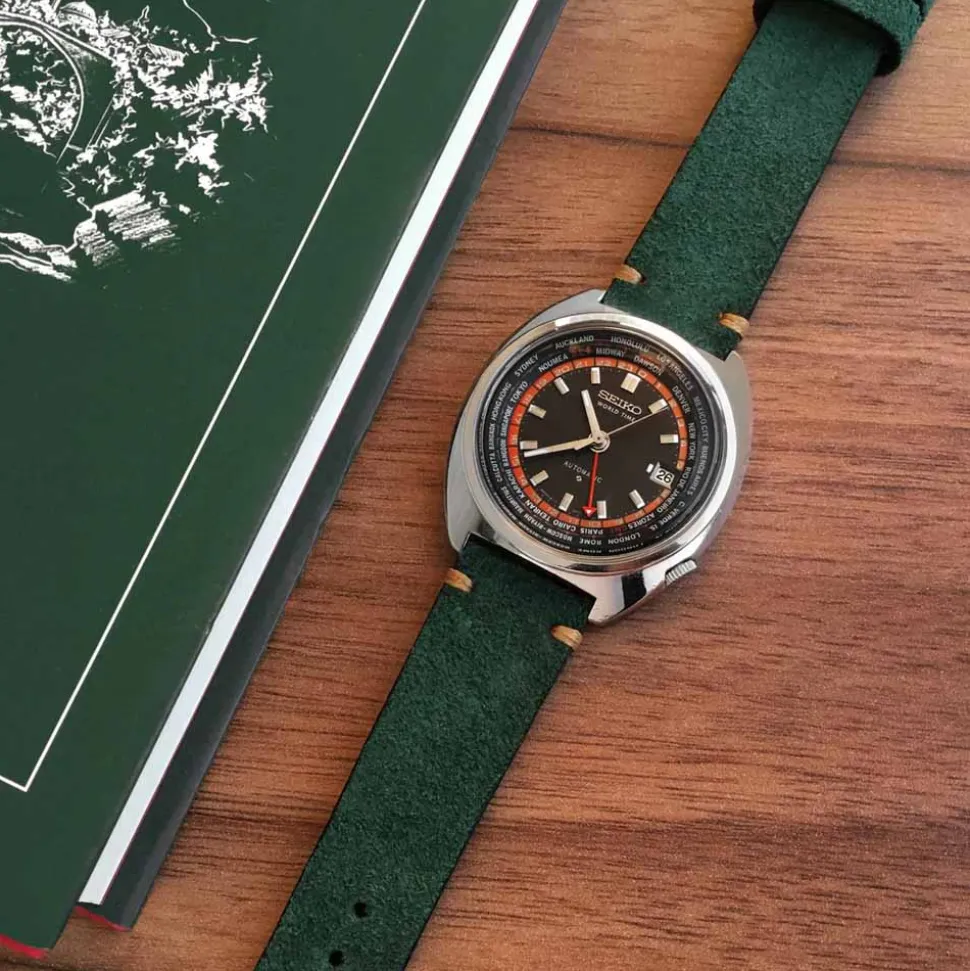 With its rich green colour and beautiful distressed texture, this strap is a perfect fit for any vintage or vintage style watch regardless of the dial color. Additionally, with a flat profile, this design will suit a variety of watches. Furthermore, two stitches at the ends and tip add a vintage detail to this strap.