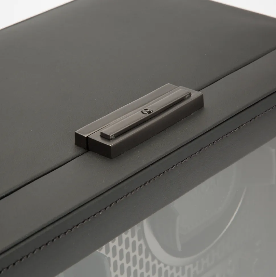 The Axis 4 Piece Watch Winder has a vegan leather exterior. Inside, powder coated laser-cut perforated steel creates a bold aesthetic. Similarly, grey powder coated hardware completes the look. Finally, a locking glass cover keeps everything secure.