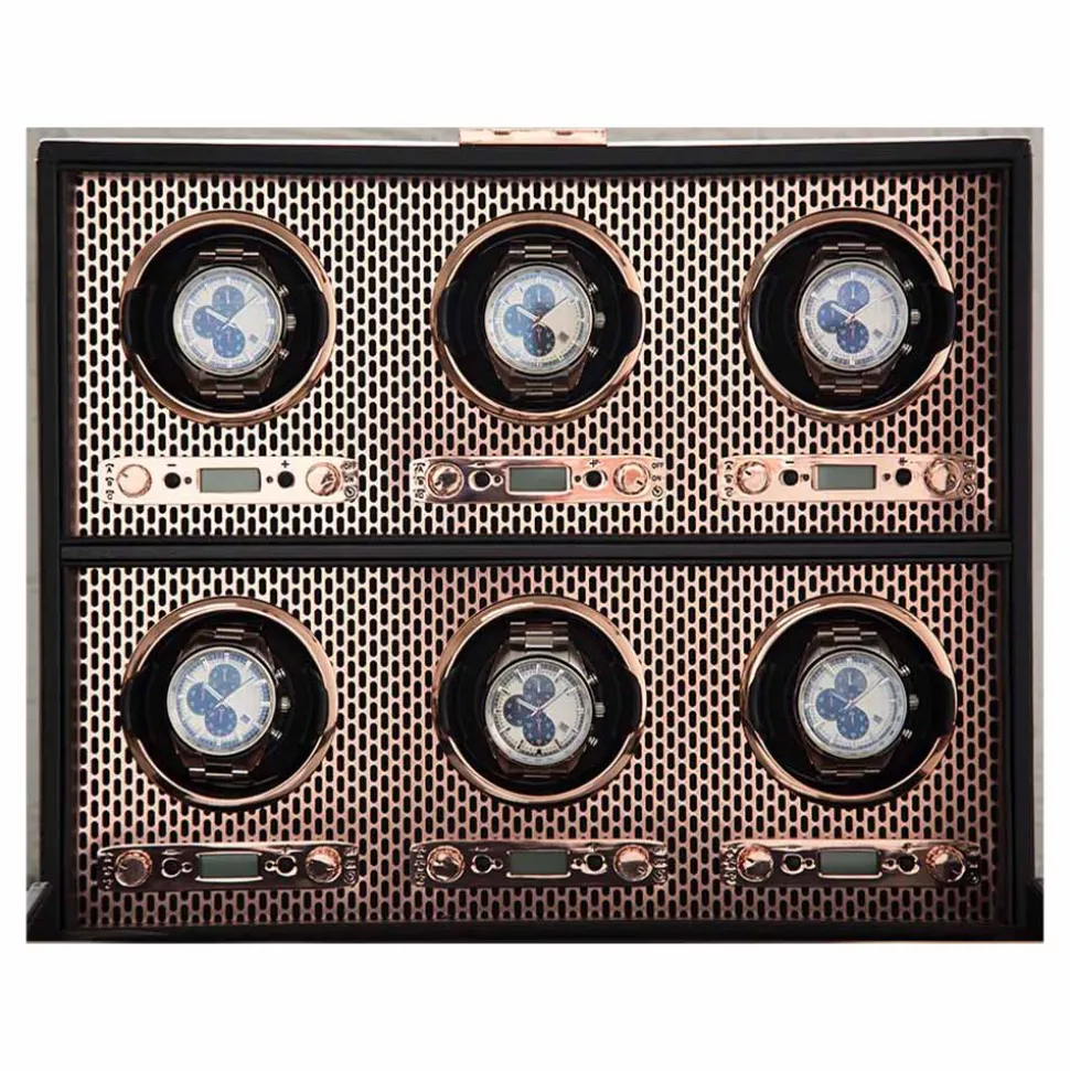 The Axis 6 Piece Watch Winder has a vegan leather exterior. Inside, copper coated laser-cut perforated steel creates a bold aesthetic (view powder coated version here). Similarly, copper coated hardware completes the look. Finally, a locking glass cover keeps everything secure.