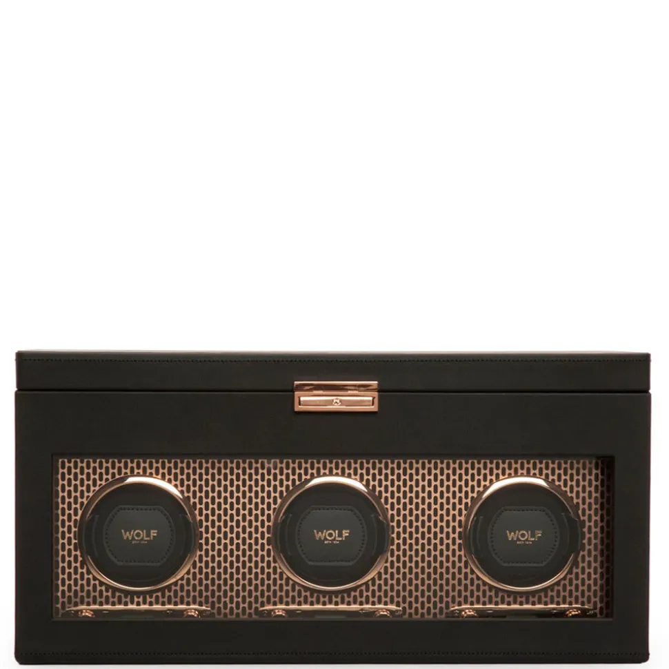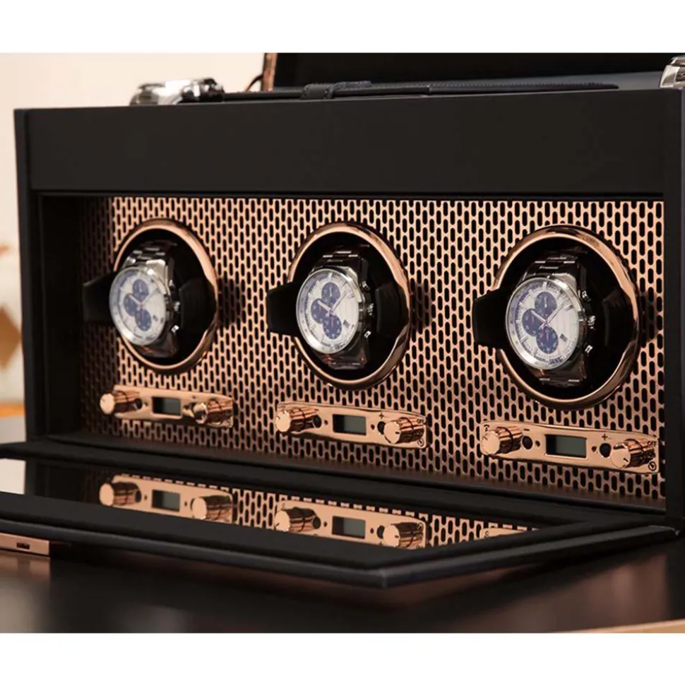This WOLF Axis Triple Watch Winder combines copper plated steel and vegan leather to bold effect. With sleek lines and modern styling, Axis provides a safe haven for your watch collection. Moreover, Axis ensures your watches are ready to wear at all times, protected and beautifully displayed.