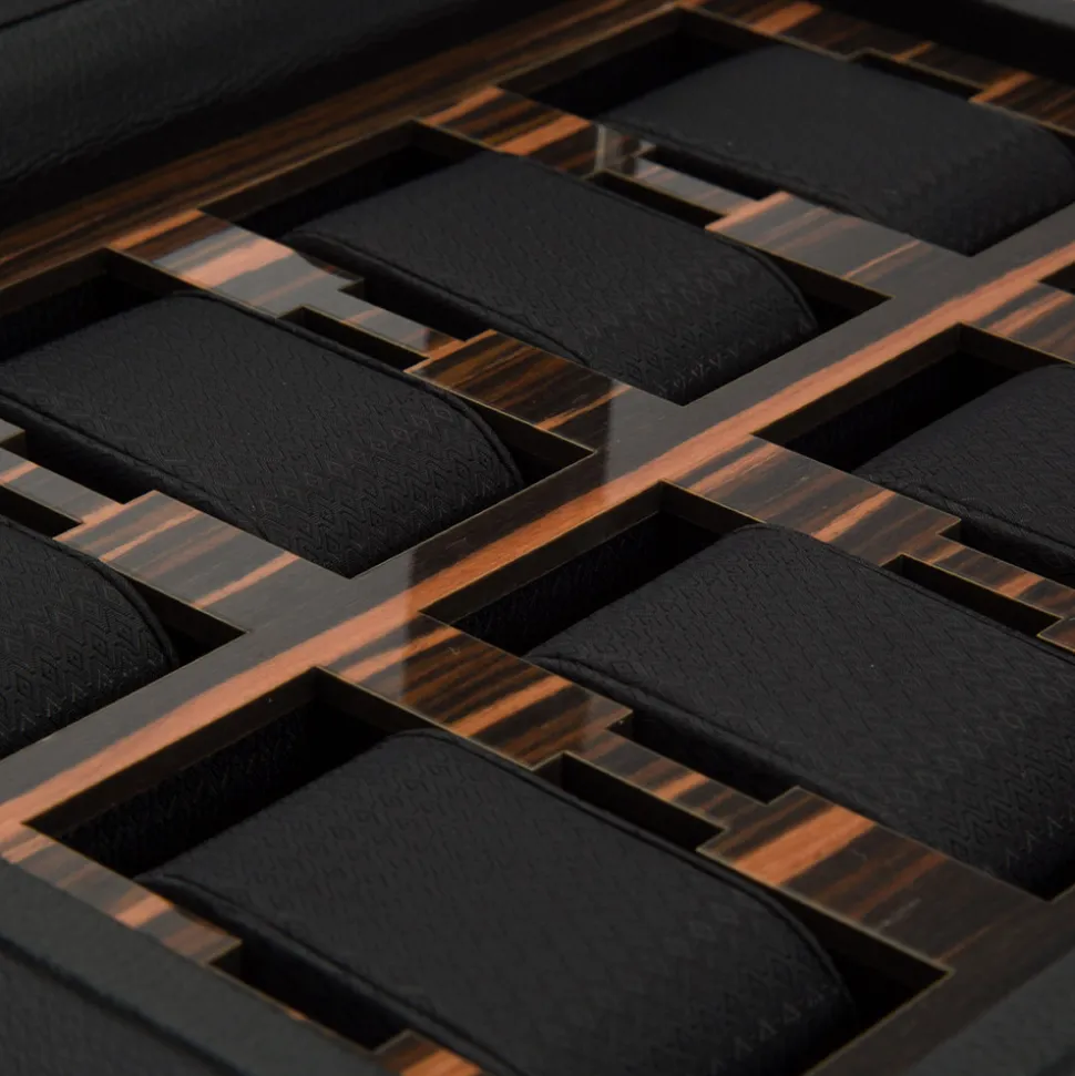 Firstly, the interior of the Roadster Storage Box has detailing in ebony polished Macassar wood. This highlights the watches in the box and tones beautifully with the black exterior. Secondly, eight suspended watch cushions in individual compartments protect each watch (view 10 Piece Roadster Box here). Furthermore, each compartment is fully lined to guard against damage.